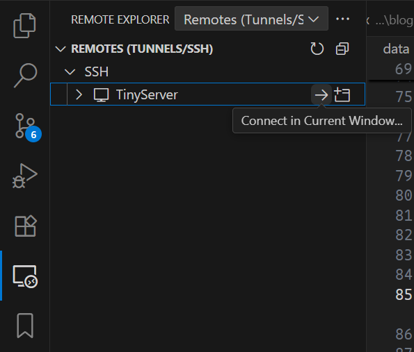 Save the file, then navigate to the Remote Explorer in the left sidebar. You will see an SSH configuration entry with the <random_name_you_want>. Click the connect button.