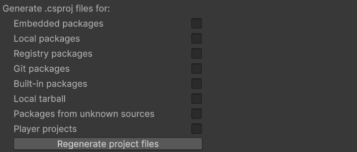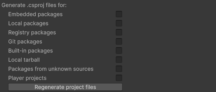 Secondly, uncheck all the options in the section named Generate .csproj files for:, just like the image below. Then, click the Regenerate project files button. You will find some new files generated in the project folder, like .sln, .csproj, etc.