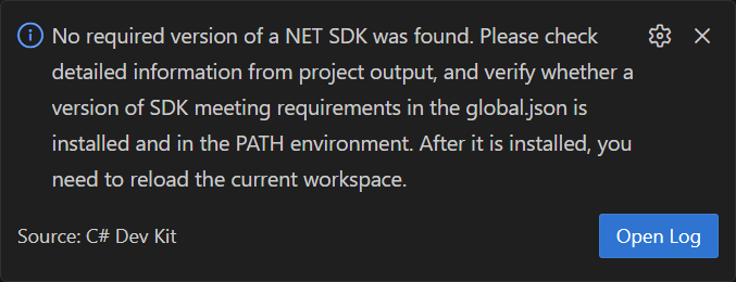 If C# Dev Kit shows you a message saying "No required version of a NET SDK was found", like in the image below: